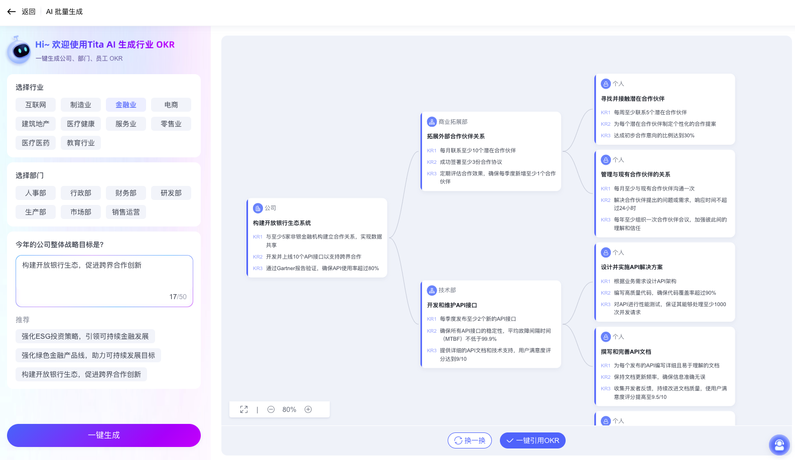 - 将年度50亿元并购融资目标分解为12个KR(关键结果),每个KR关联3-4个具体项目
