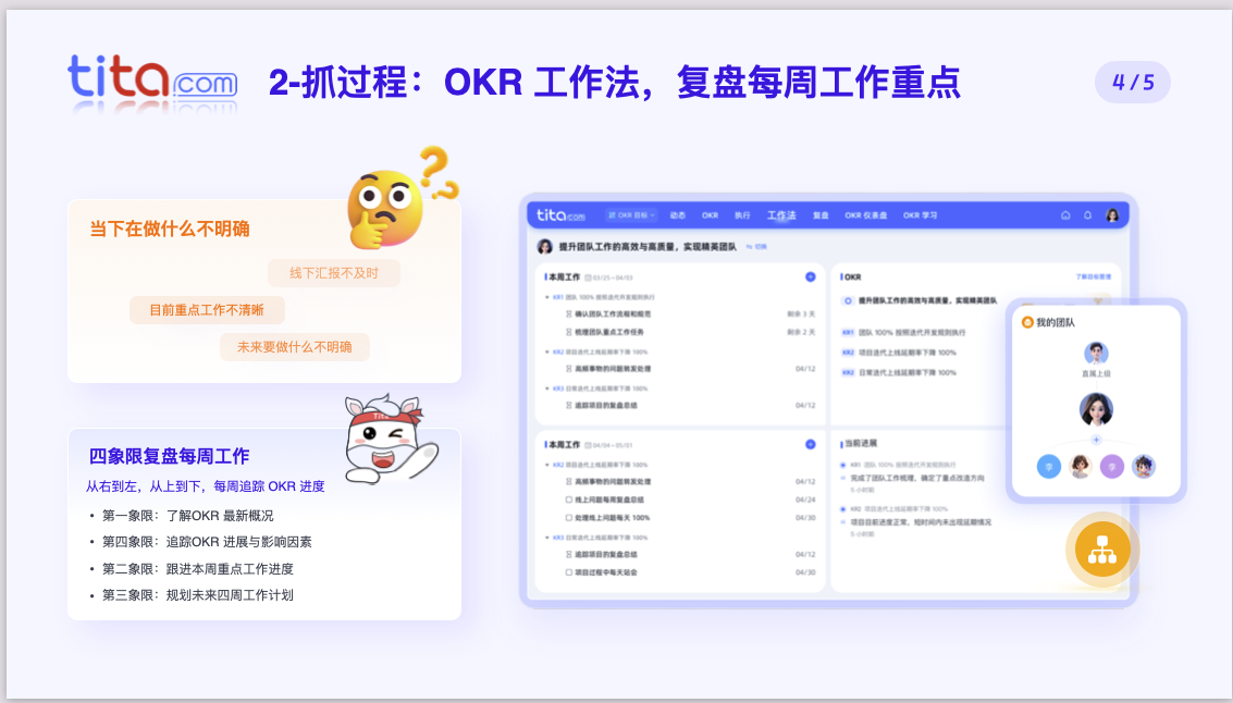 建立周例会、月复盘机制。每周团队成员在 Tita 平台填写周报,更新 OKR 进度,标注完成情况、遇到的问题及解决方案。月度复盘时,通过 Tita 的 OKR 仪表盘,直观展示 OKR 完成进度,分析偏差原因,及时调整执行策略。例如,若某产品开发进度滞后,复盘会议上可协调更多资源或优化开发流程。