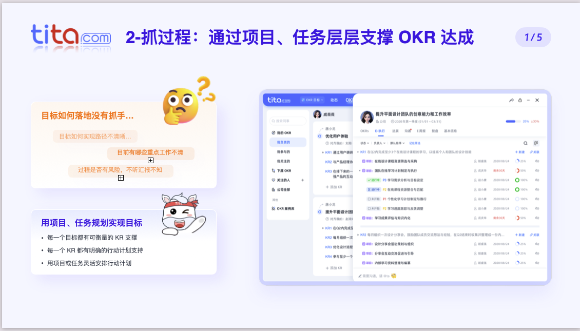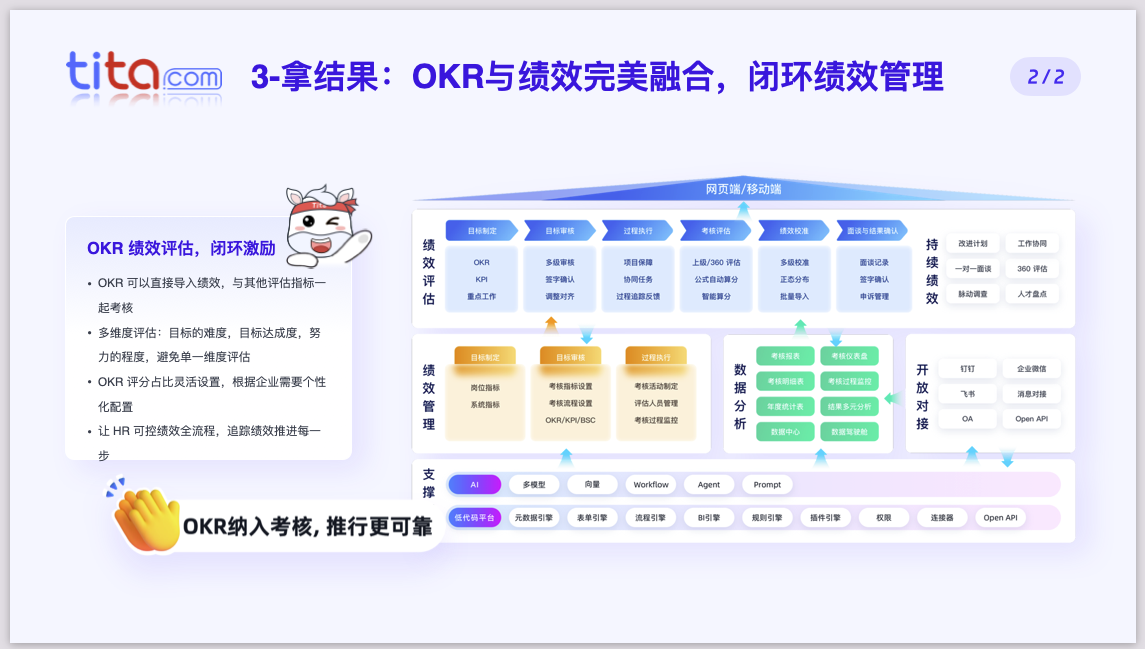 - 考核模板:Tita预设“服务行业OKR考核表”,支持自定义权重(如“客户满意度”占结果考核30%)