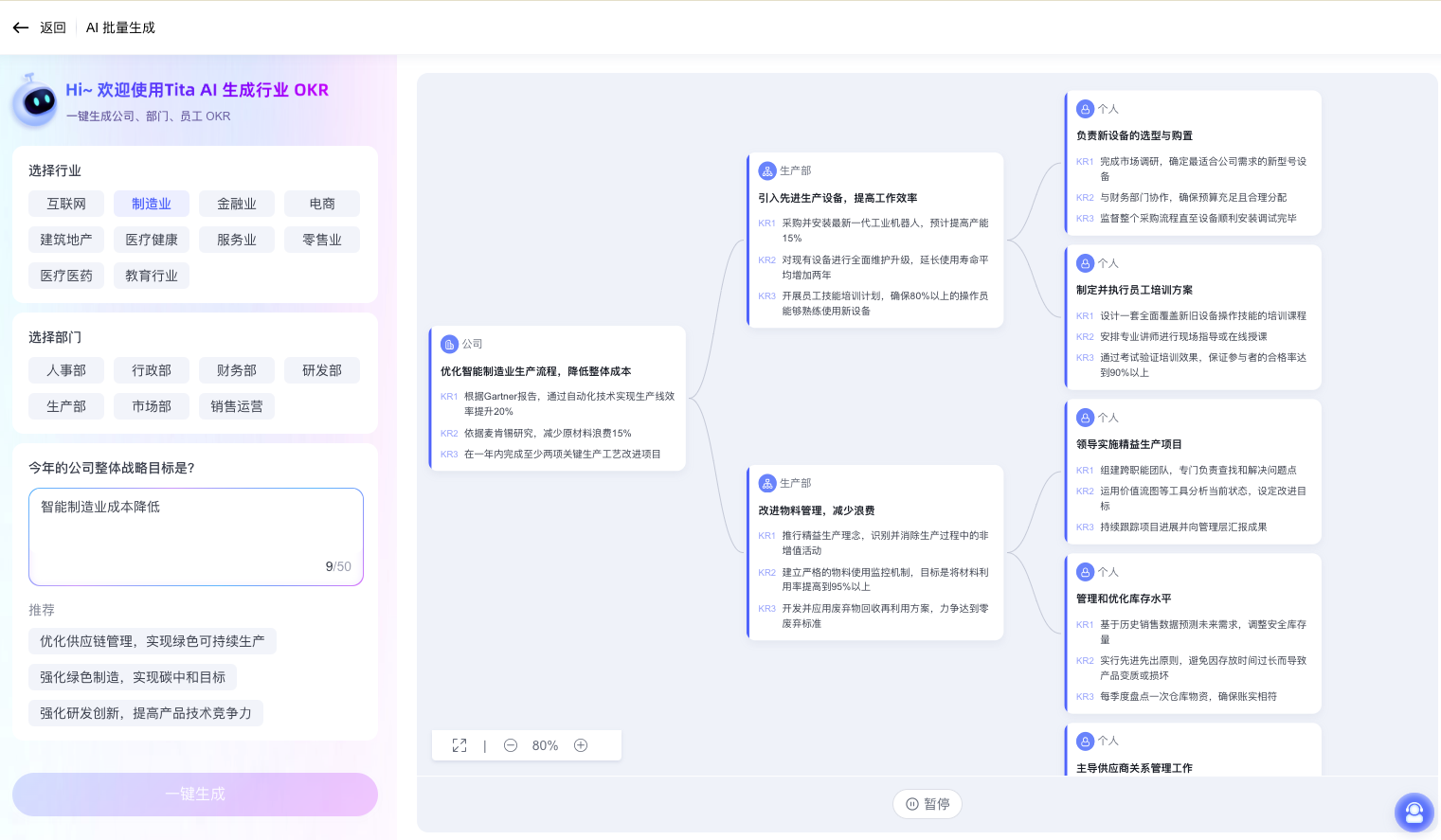 - AI 辅助目标生成 :Tita 的智能 AI 技术能够依据企业的历史数据、行业标杆以及市场趋势,为企业提供 OKR 制定的参考建议。在设定成本控制 OKR 时,AI 可分析过往成本数据和行业成本水平,给出合理的成本降低目标及对应的关键结果,如 “本年度将原材料采购成本降低 10%”,关键结果包括 “与 3 家供应商重新谈判,降低采购单价 8%”“优化生产工艺,减少原材料浪费 5%” 等,提升目标设定的科学性和效率。