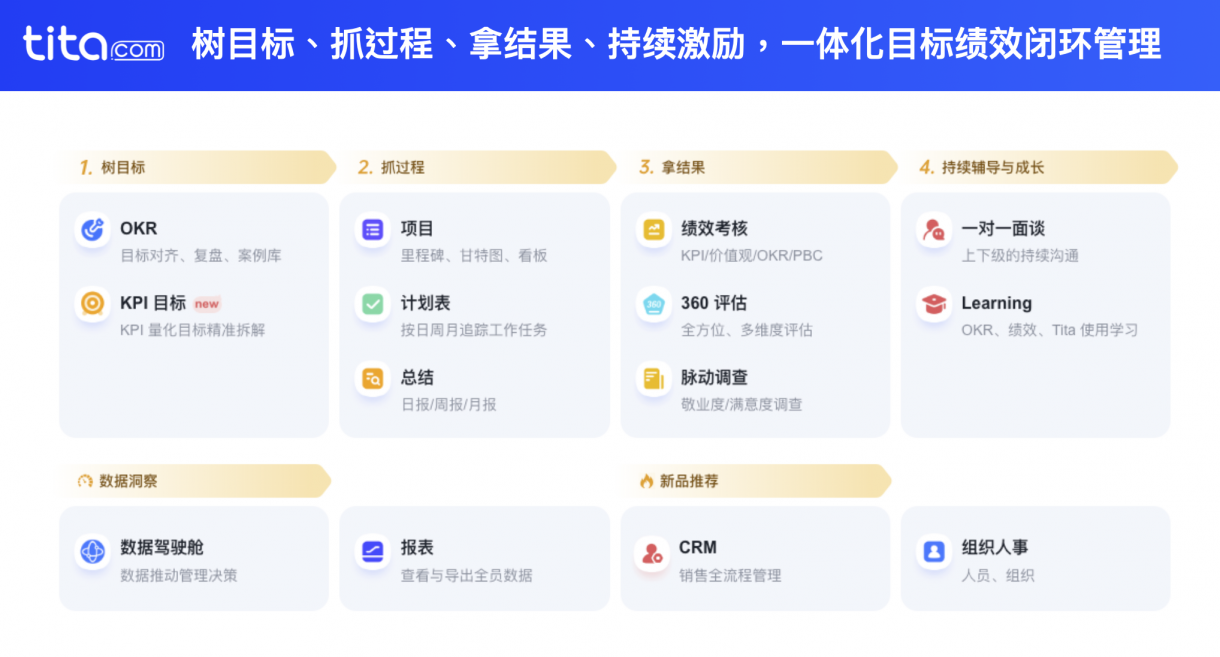 Tita 新绩效一体化产品通过在项目制考核的目标设定、执行跟踪与结果评估等关键环节的创新优化,为企业打造了一个完整、高效的项目制考核管理体系。它帮助企业突破传统项目制考核的困境,提升项目管理效能,激发项目团队的活力与创造力,是企业在项目驱动型发展模式下实现持续进步的得力工具。如果您的企业正在探索或已经采用项目制工作模式,不妨尝试 Tita 新绩效一体化产品,开启项目制考核的全新征程,在激烈的市场竞争中抢占先机,实现项目的卓越交付与企业的长远发展。