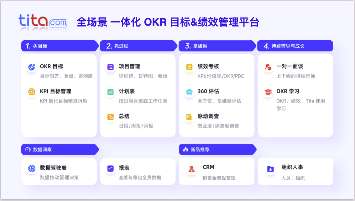 索取企业OKR和绩效管理成功案例,直观体验《Tita一体化管理平台》,立即申请 《Tita 产品演示》 或 最受客户欢迎的《帮我配置考核表》 。