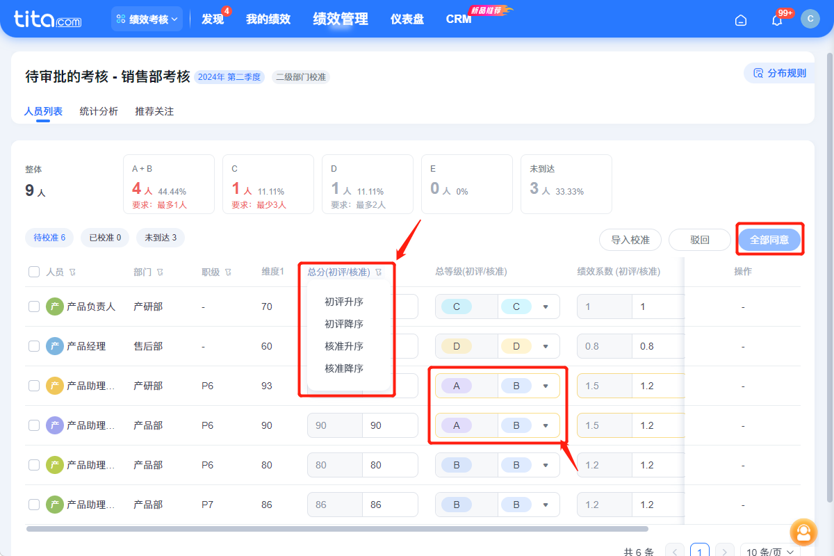 评价表单内置制药行业模板库,包含GMP合规行为、数据完整性等特殊指标。 - 校准会议支持:Tita提供绩效校准看板辅助校准会议: