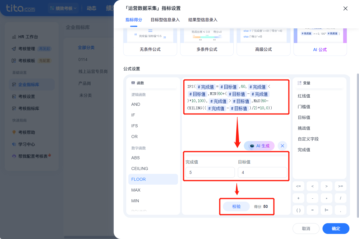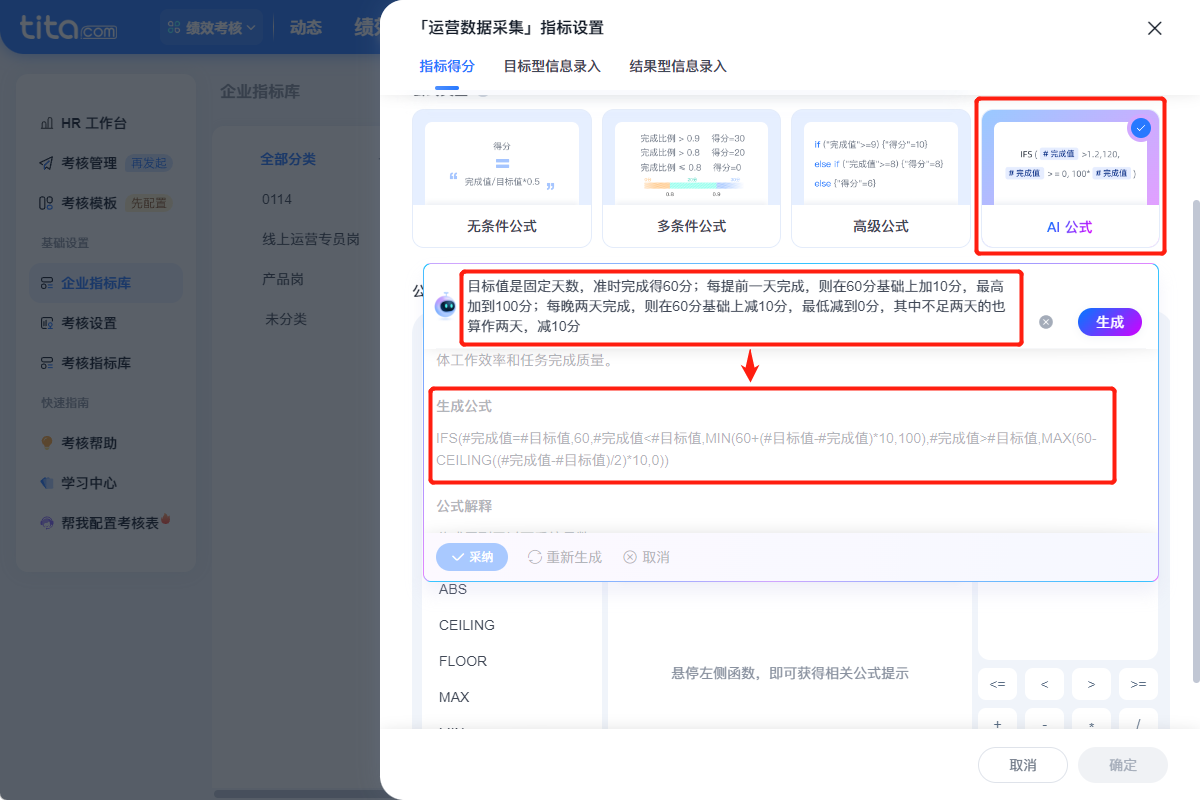 输入 “行业+岗位” 关键词,Tita AI 小助手自动生成专属考核方案,并一键套用到系统模板中,并可在其基础上进行调整,耗时仅需 1 分钟