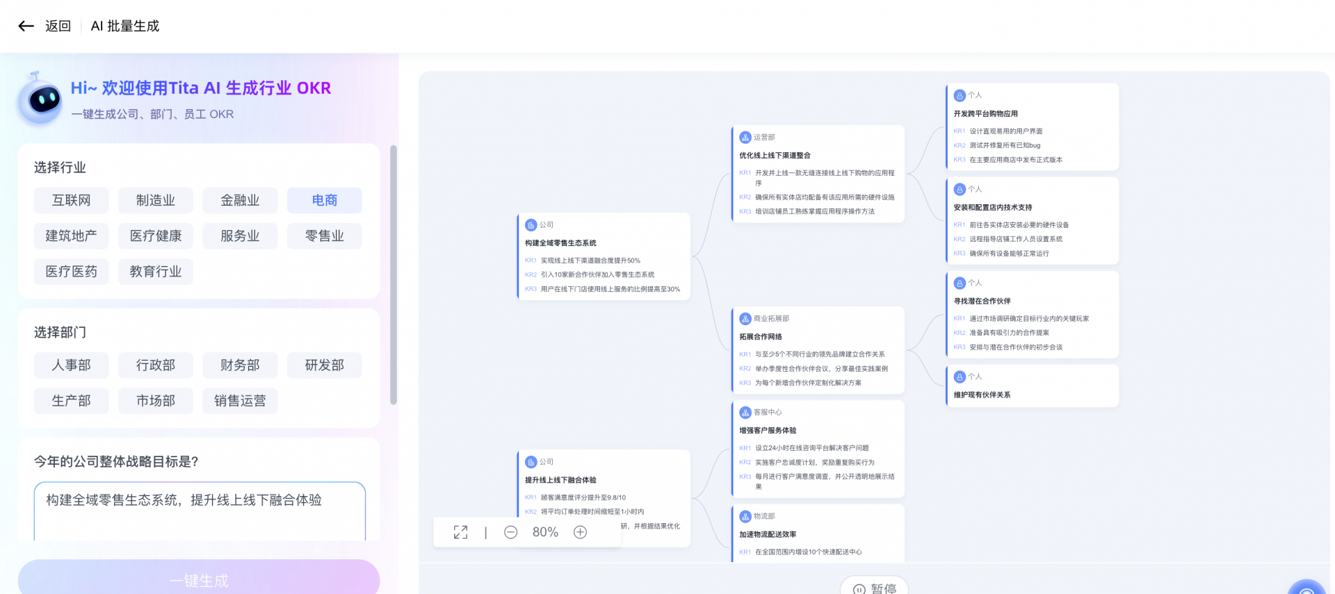 Tita的智能AI技术基于企业海量的历史交易数据、行业最新动态以及市场趋势预测,为目标设定提供极具价值的参考建议。企业在设定目标时,AI能迅速生成多个贴合实际的目标和关键结果选项,企业再结合自身战略规划和资源状况进行筛选优化,极大地提升了目标设定的科学性与效率。针对电商行业变化快的特点,Tita特别设计了敏捷目标调整机制。例如,当该企业在Q2发现直播渠道增速超预期时,通过平台快速新增”直播团队搭建”子目标,并实时调整资源分配,确保战略能够灵活应对市场变化。