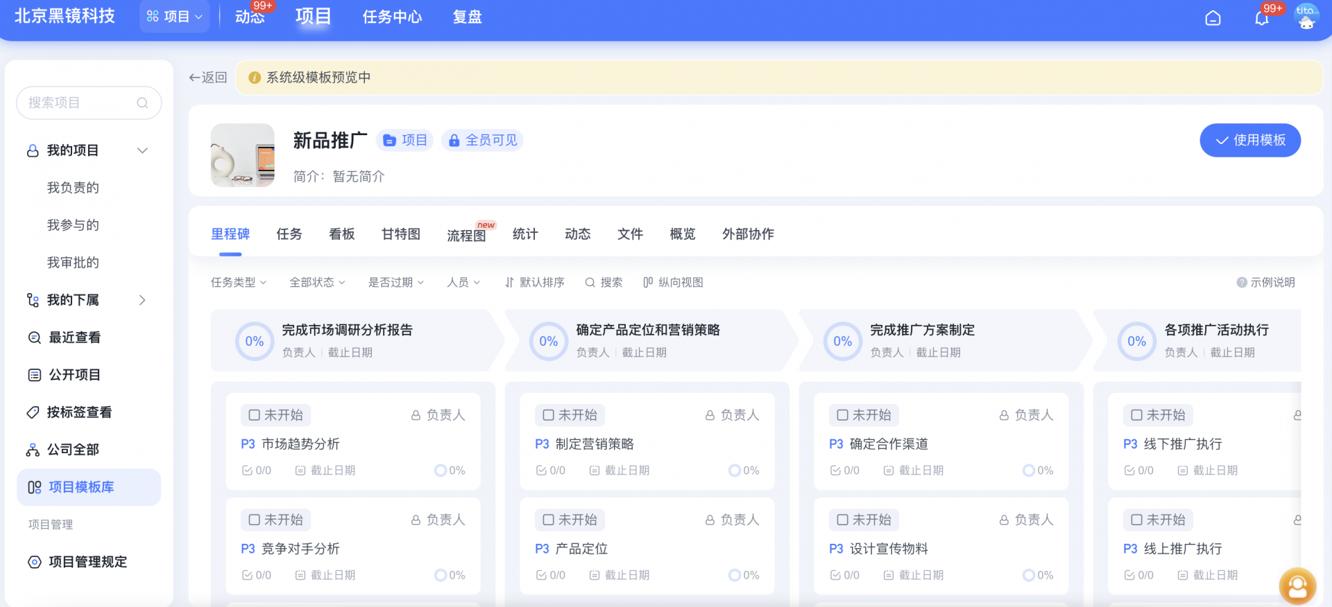 Tita平台将OKR与项目管理深度融合,把OKR中的关键结果拆解为具体项目任务,并明确责任人与时间节点。例如,将”提升复购率至25%”这一KR拆解为:会员体系改版(产品部)、精准营销系统上线(技术部)、客户分层运营方案(运营部)。项目执行时,团队成员通过Tita实时更新任务进度,项目负责人和管理层借助直观的项目进度看板,对每个OKR相关任务的进展一目了然。系统设置自动预警机制,一旦发现进度滞后,立即通知相关人员,方便及时调整策略。